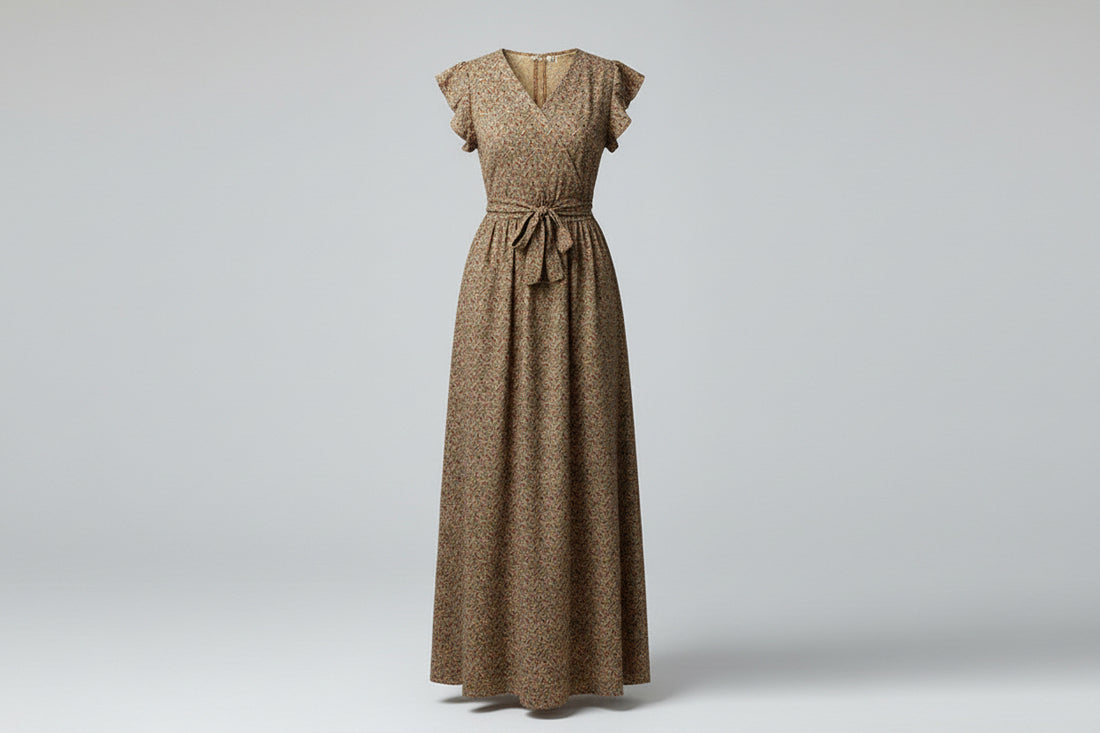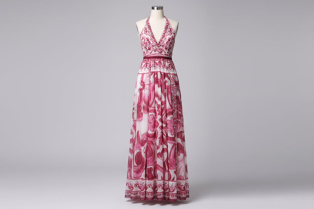 Elegant Floral Cross V-neck Waist Trimming Ruffles Long Dress