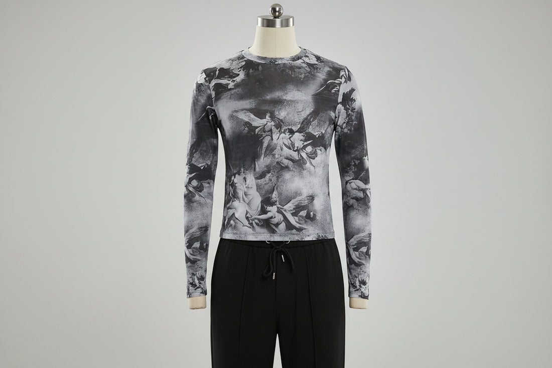 Black & White Classical Painting Print Slim-Fit Long-Sleeve Top