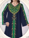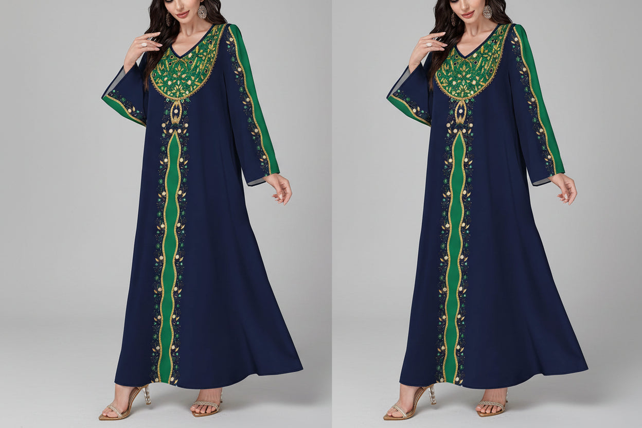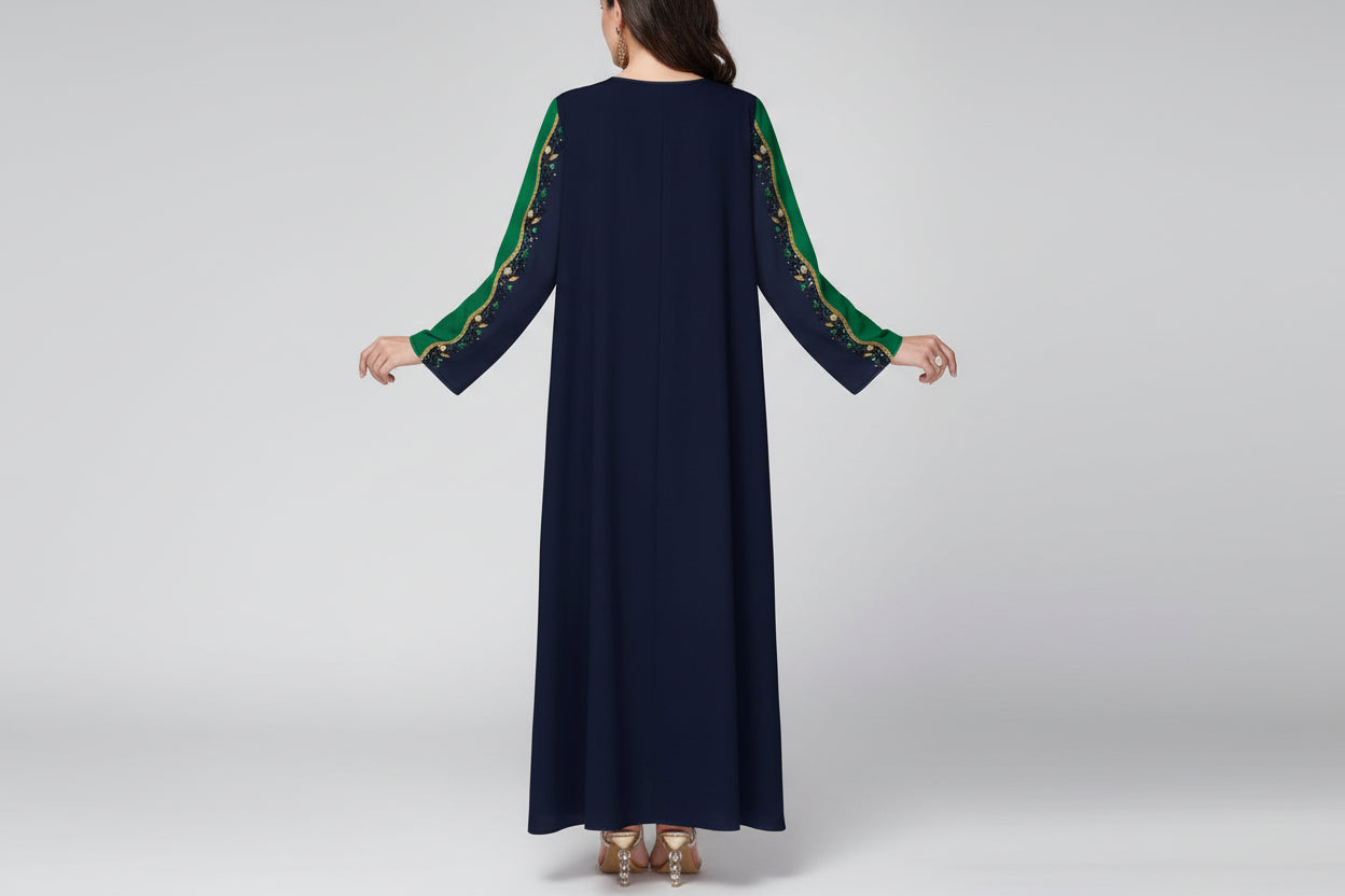 Designed for those who seek sophisticated and modest fashion, this maxi dress offers a flowing silhouette that combines the traditional grace of an abaya with modern evening gown aesthetics. The intricate gold filigree runs vertically down the center and along the wide, elegant sleeves, creating a slimming effect and adding a touch of formal opulence. Perfect for high-end celebrations, weddings, or evening galas, this patterned masterpiece ensures an elegant presence. With its rich color palette of navy and emerald green, this ornate kaftan is a timeless addition to any luxury wardrobe, promising a look that is both sophisticated and unforgettable.